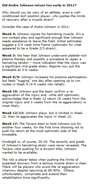 NFL players re-aggravate hamstring injuries nearly 33% of the time, according to this study. Re-aggravations occur most often within the first ten days of return to play and the aggravated strain is often worse than the original injury. That’s likely because an NFL player is generally allowed to return to full football related activity when the injured muscle has recovered to about 95% of full strength (when tested against the opposite side of the body isometrically). A player returning at the early end of his expected recovery, then, is either an extremely fast healer or is pushing the limits of expectation. Without the benefit of hindsight, you’ll not know which. Consider an early return a red flag, unless…