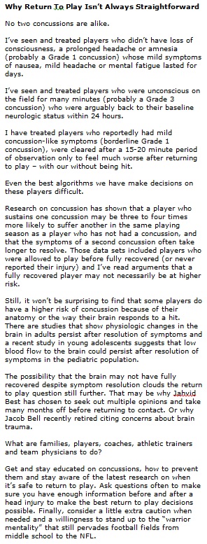 The algorithm also includes strict guidelines for clearing a player for future contact. A player must pass a series of neurologic exams, after 24 hour periods of no activity, light exercise and more vigorous exercise. The process must be started over if there is any recurrence in symptoms. He must also pass cognitive tests (when compared to preseason healthy baselines) and be cleared by an independent neurologist. The process generally takes a minimum of 4-5 days.